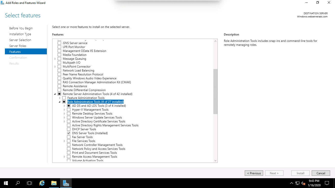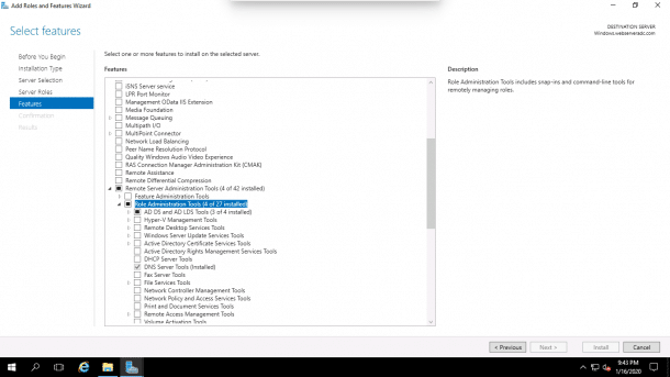 4. Click on the Remote Server Administration Tools => Role Administration Tools => AD DS and AD LDS Tools and click on the Install button.