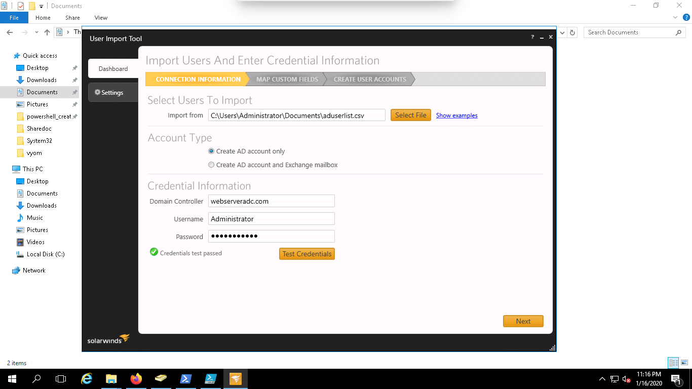 1. Open the SolarWinds Tools, select the CSV file, Provide your domain name, administrator credential and click on the Test Credentials as shown below: